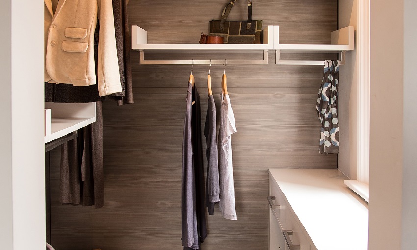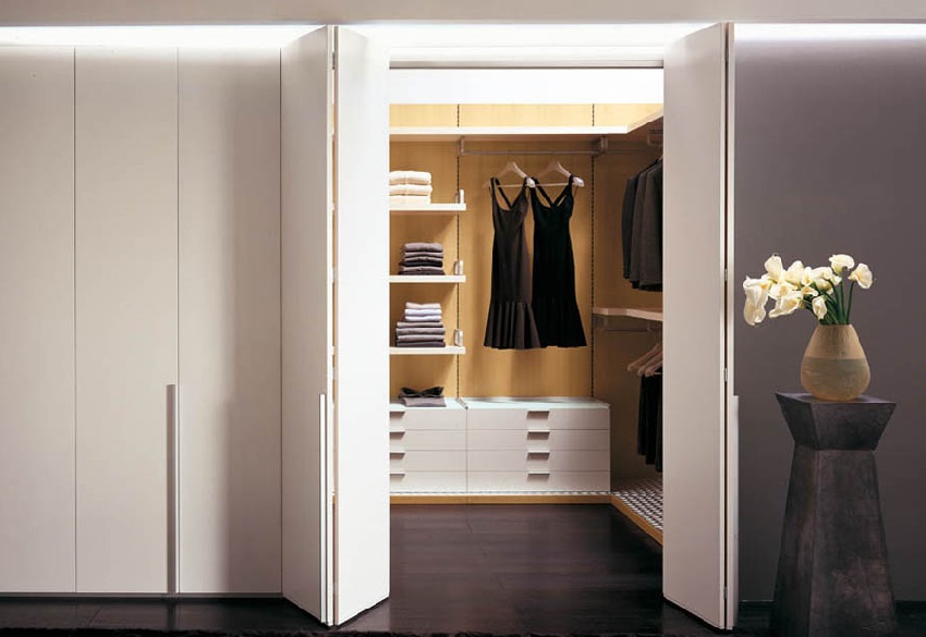 A photo of small dressing rooms from pantries clearly illustrates the options when the entire length of one of the walls is used for the storage system. With such a project, you can carve out additional space so that you can enter the dressing room to find the right things. However, in order to use the space of the mini-dressing room as much as possible, it is recommended to arrange them as a niche, which is fenced off from the main room by an accordion door or a sliding compartment door.