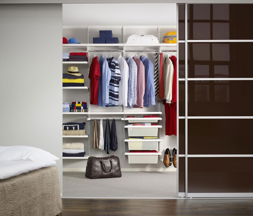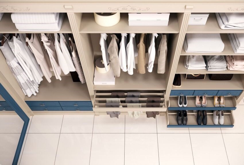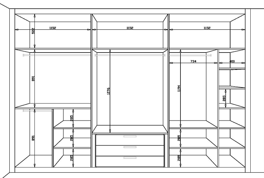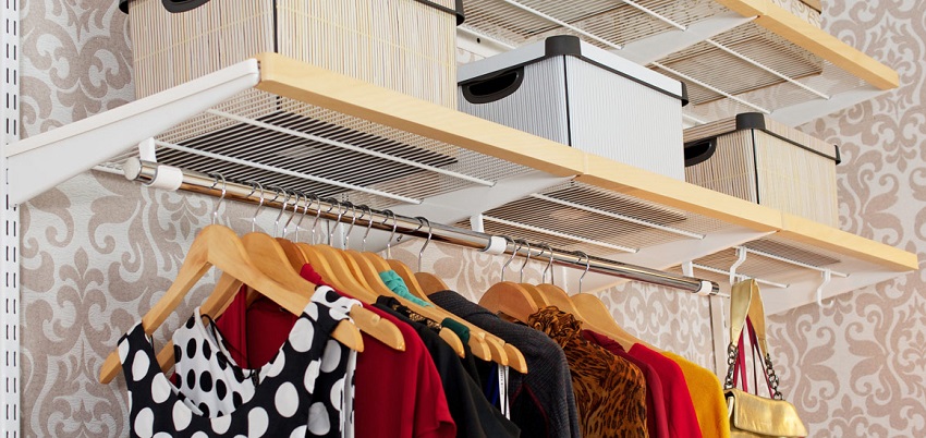 - middle compartment - used mainly for storing frequently used items. It is equipped with rods, pantographs, as well as pull-out shelves for storing small toilet items. Depending on the length of things, the height of the middle zone varies from 140 to 170 cm. Approximately 100 cm is allocated for storage compartments for shirts and jackets. It is convenient to store jerseys in baskets and boxes installed on the shelves;