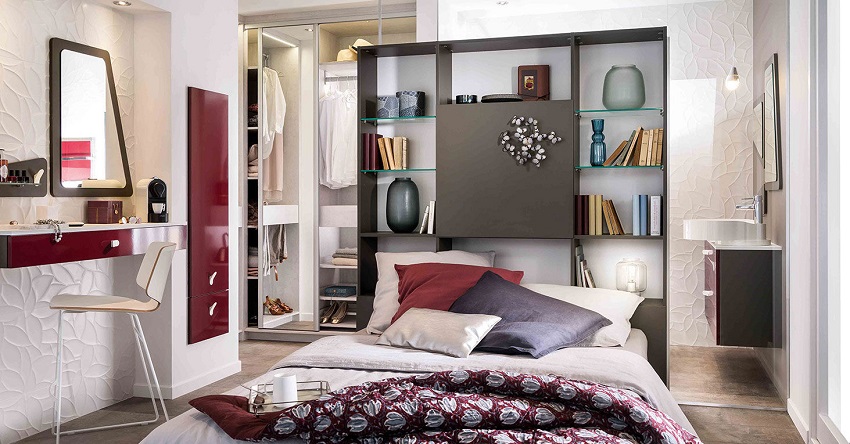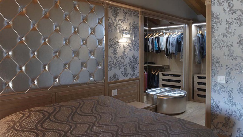 Useful advice! An interesting idea to arrange a dressing room in the bedroom behind the head of the bed: it is separated by a light stationary partition or sliding systems.