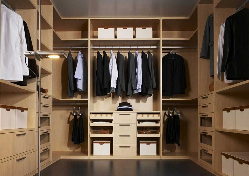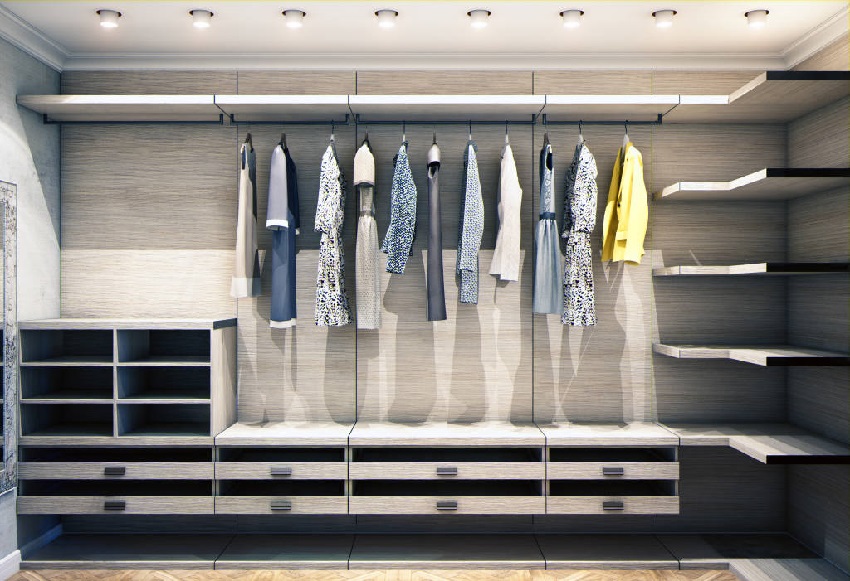 The selection of material for the interior filling of the dressing room depends on the intended storage system. It is calculated according to the drawings and diagrams of your project. Usually for these purposes they acquire: