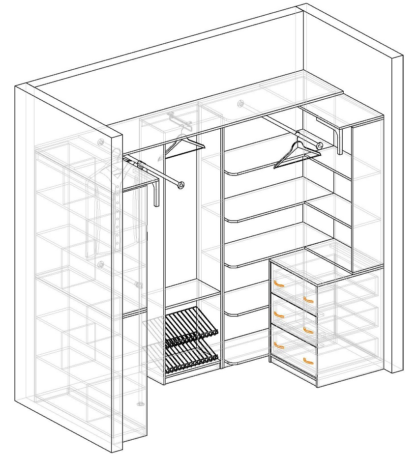 In the second option, the location of the filling is planned along two walls. The main advantage of such filling is compactness with maximum capacity. However, it is worth considering that you can simply enter such a dressing room, but you will not be able to use it as a fitting room. This method of filling is suitable for families of several people, where the main task is to maximally fit the things of each of the household members. For filling, storage systems with a set of corner components are used, which provide good ergonomics of a small space.