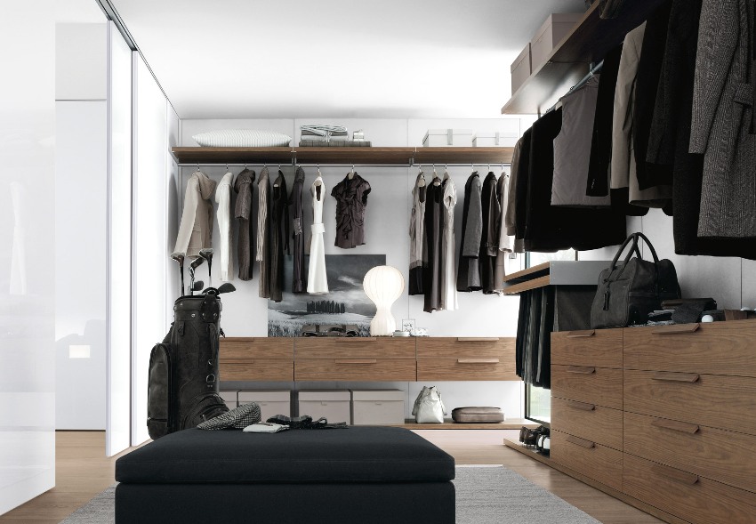 Many of us remember storage rooms, the presence of which was observed in almost every Soviet apartment. Such rooms resembled gloomy closets, in which things and household items were randomly stored and it was rather difficult to find the right one among them. Today, design projects for dressing rooms are developed in such a way that any things stored in them can be easily and quickly found. Visibility and accessibility is achieved by using an ordered system of accessories for convenient storage of clothes, shoes and household items.