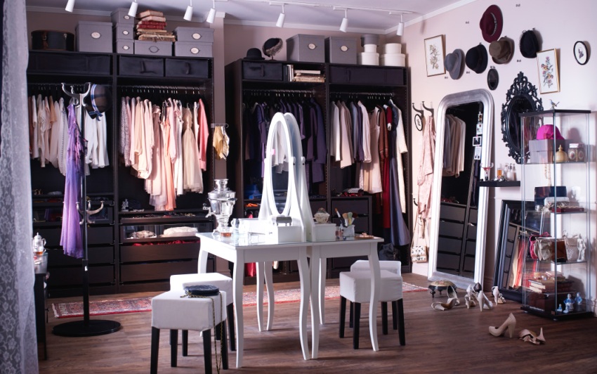 It is worth noting that it is necessary to choose furniture taking into account the area allotted for the dressing room: when space is limited, it is preferable to use open-type furniture; for spacious rooms, you can choose closed shelving and cabinets that can be equipped with mirrors. As a division of weighty dressing rooms into separate zones, you can use graceful screens.