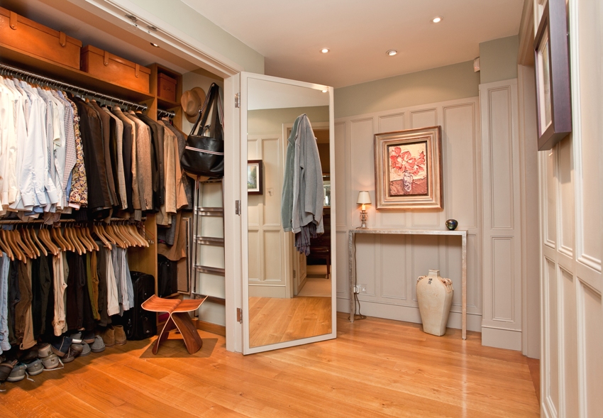 Almost all spacious dressing rooms are equipped with mirrors and furniture for relaxation. In such a room, you can not only store things, but also in quiet solitude, think about an outfit for a particular event. The sufficient area of such rooms allows storing light folding furniture, for example, chairs, as well as seasonal sports equipment. The main thing is to know when to stop and not to turn the dressing room into a messy warehouse of unnecessary items.