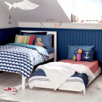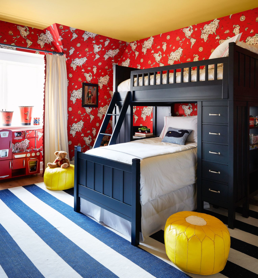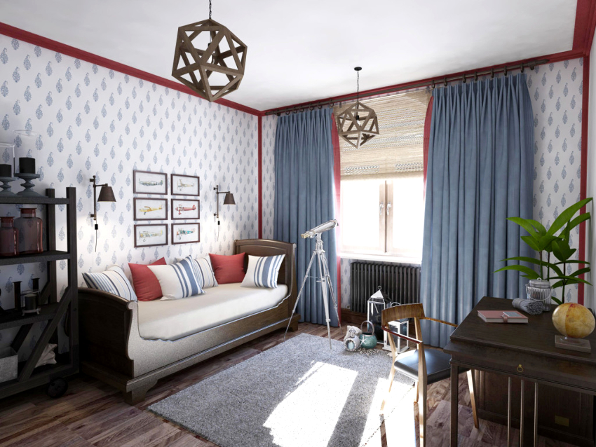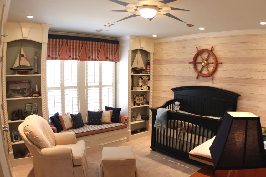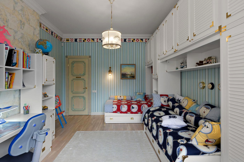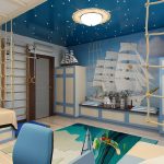 Nautical. Suitable for decorating a boy's room of preschool and school age. The style assumes the presence of striped surfaces using white, cyan and blue colors. An accent wall with a large map of the world will look good. The Pirate Chest can be used to store toys.