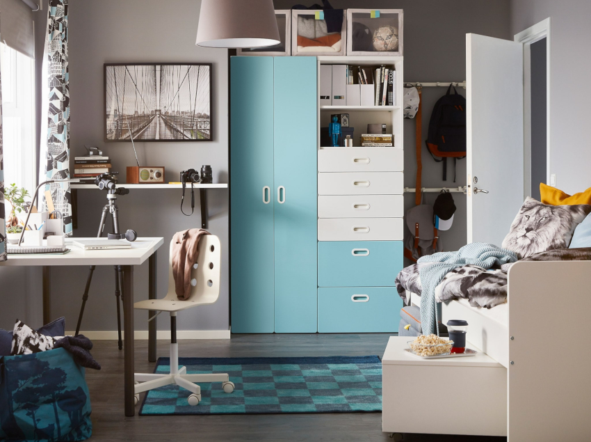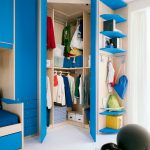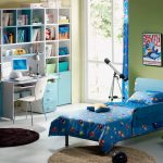 The older the child, the more space is required to store things, shoes and other small items. For this purpose, sliding wardrobes, racks, open and pull-out shelves are used. The more places to store small things, the easier it is to organize the order in the room.