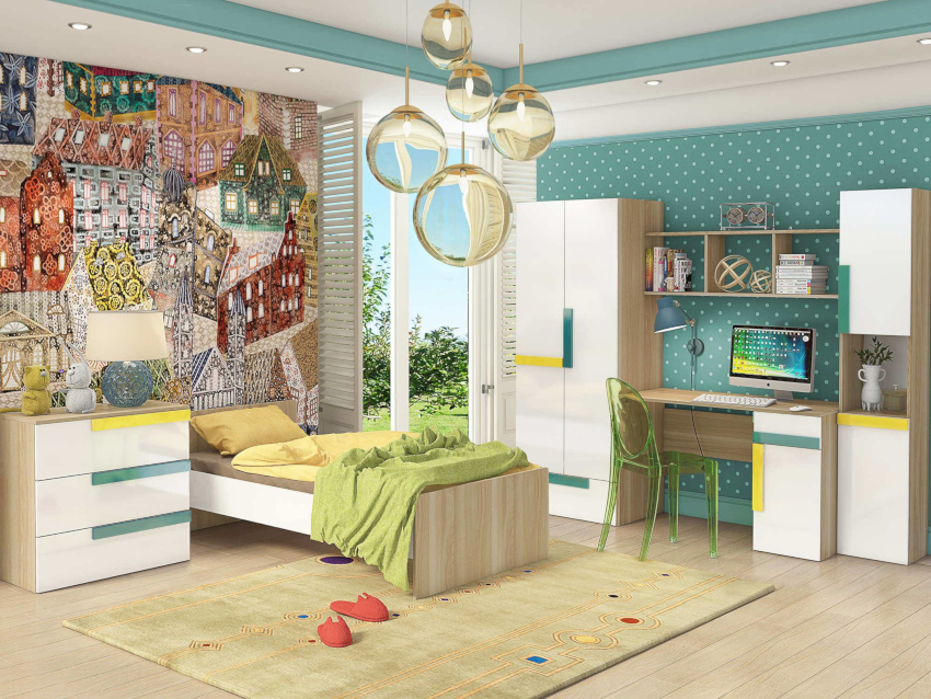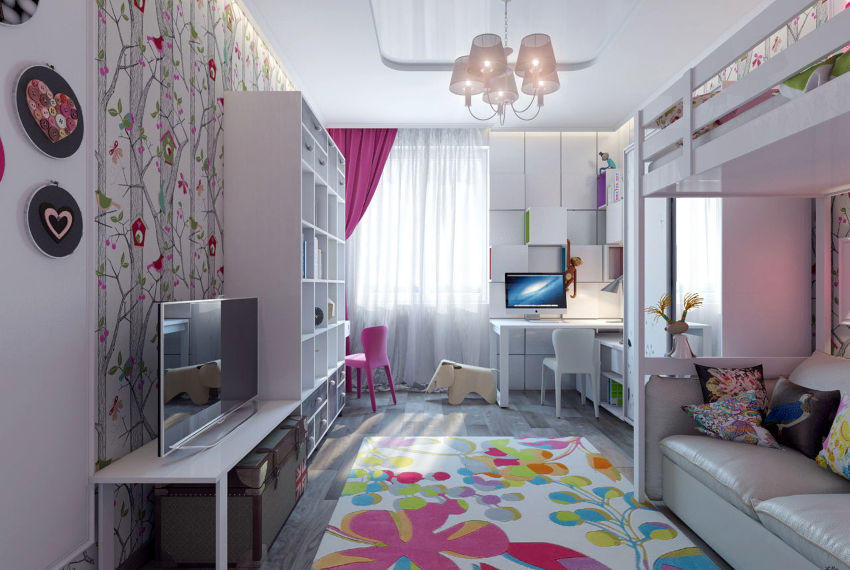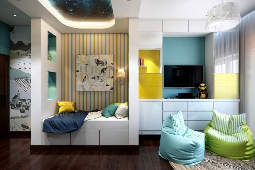 Several functional areas should be isolated in the room: work, for sleep, rest and play, a place for storing clothes