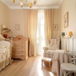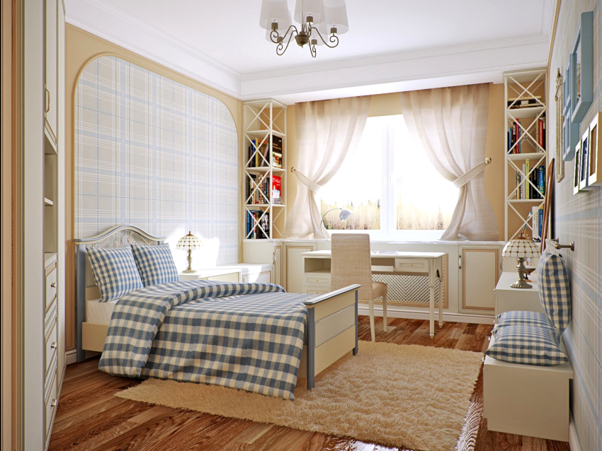 Classical. Suitable design for a child's room for a girl and a boy. The presence of pastel colors is characteristic: cream, beige, wood-like. The room should contain wooden pieces of furniture and characteristic textiles.