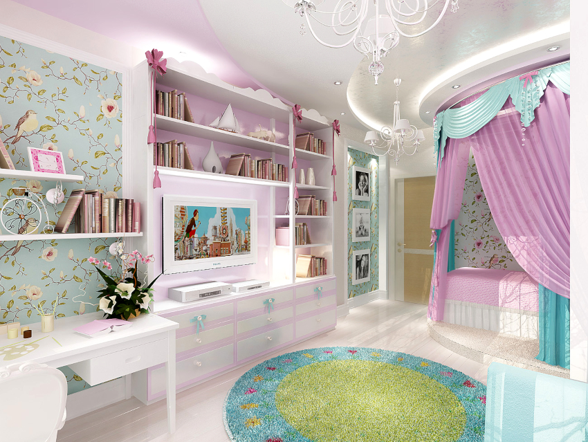 When organizing the interior of a girl's room, it is advised to pay special attention to textiles, since it is the quality of the fabric that sets the general tone for the character of the room. Most girls prefer the use of ruffles and lace products, which have long been considered classic attributes of girls' rooms. Recently, the use of velvet and velor, which look very noble, has become increasingly popular.
