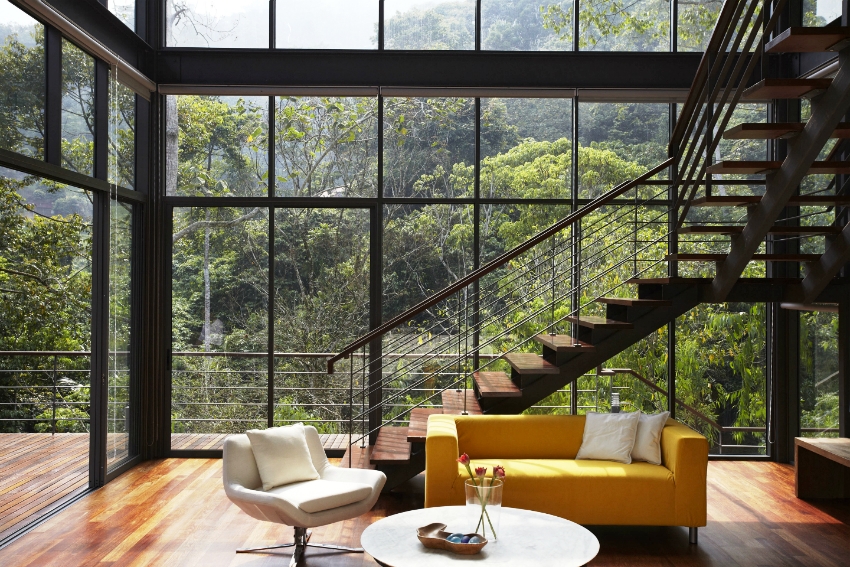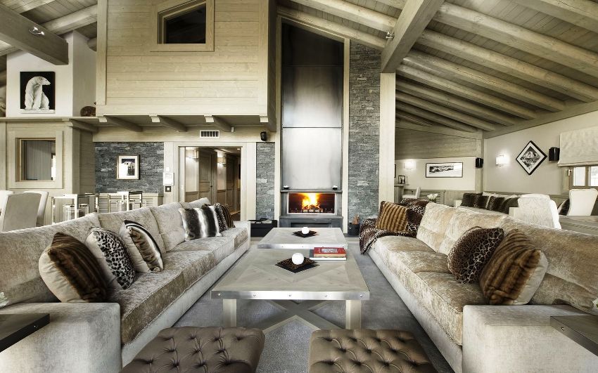 Chalet style originated in the highlands in the south of France in the 16th century. Ideas for the interior of houses designed in this direction were borrowed from the shepherds. This style necessarily involves a combination of wood and natural stone. In the photo of the beautiful interiors of houses in the chalet genre, you can see massive ceiling beams and pilasters. The walls are often made of unpainted wood. In such a room there is always a basement and a stone-lined wall. The walls in the rooms are not plastered and rarely covered with wallpaper. Only wooden furniture is used: massive wardrobes, beds, tables and chairs are appropriate here. With the help of large panoramic windows, the room is saturated with natural light.