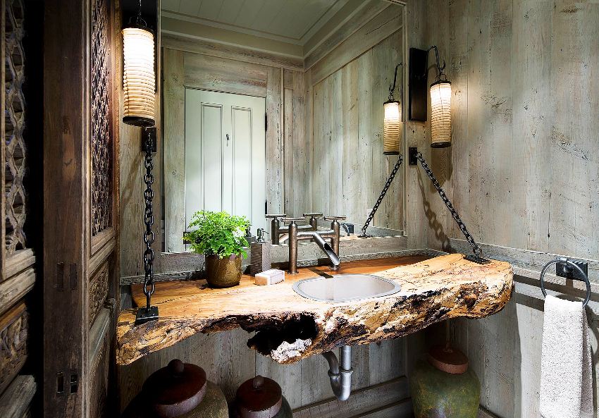 The beautiful interior of the rooms is created by finishes that match the wooden floors and walls. If plaster was used to decorate the wall, then you need to use wood-like wallpaper or other natural materials during the repair. In addition, you can treat the walls with clapboard, decorative plaster. It is recommended to hide cables and other elements under wooden boxes or close them with furniture. The floor should be covered with a carpet made in ethnic style, or you should make your own carpet from scraps of old fabric. If the ceiling is wooden or made of beams, then it is better to leave it as it is. The color scheme of the rustic style suggests the following colors: