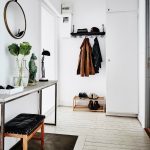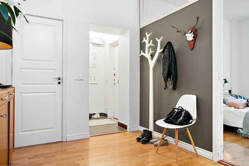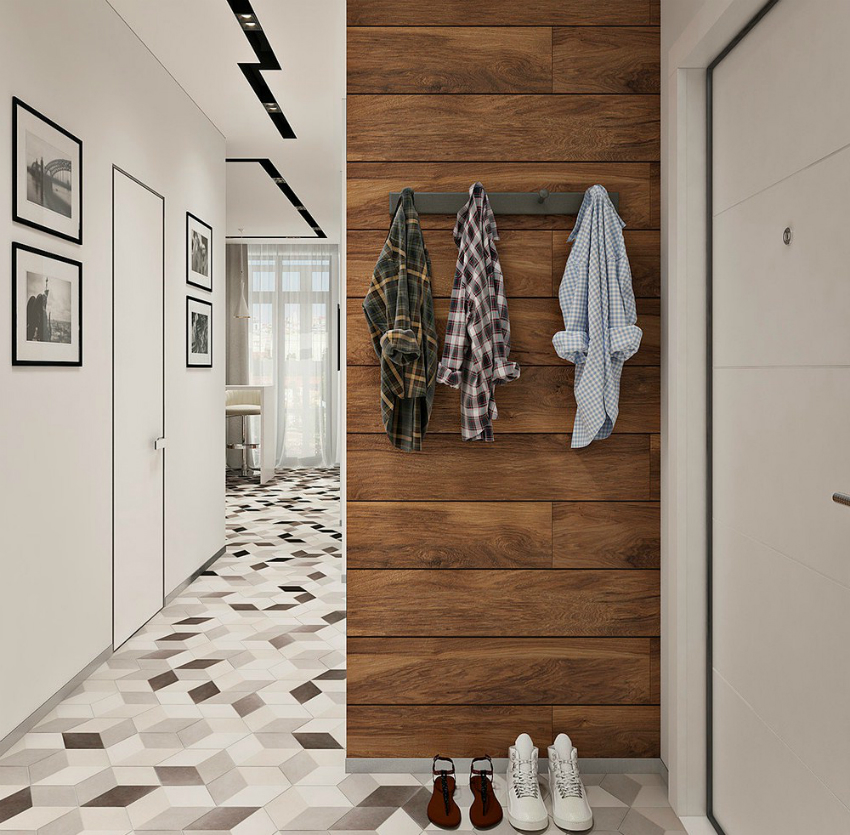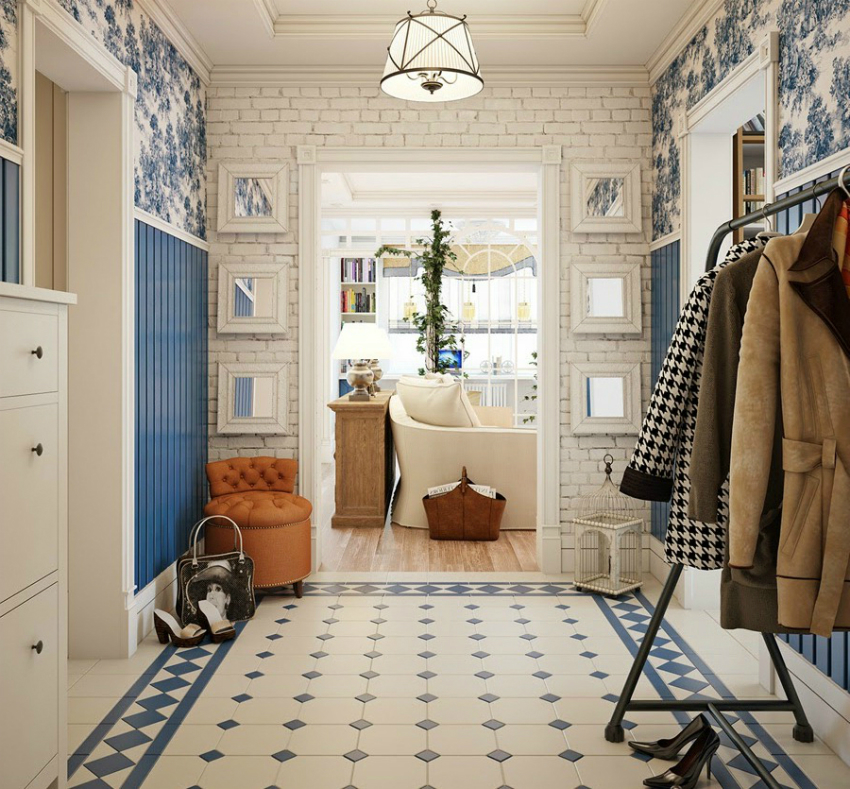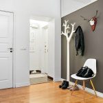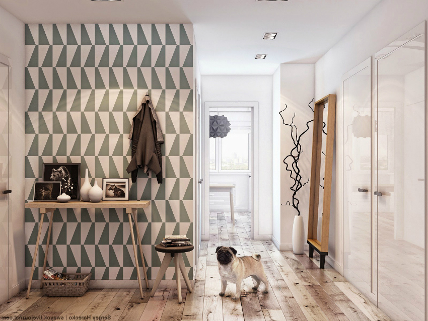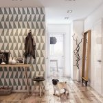 For the decoration of small hallways, only light colors should be used. Wallpaper can be with a small pattern. If it is horizontal, it will visually expand the room; if it is vertical, it will make it higher. Such a design technique is clearly visible in the photo of the interiors of 1-room apartments. The floor covering must be moisture resistant and easy to clean. Tiles are ideal.