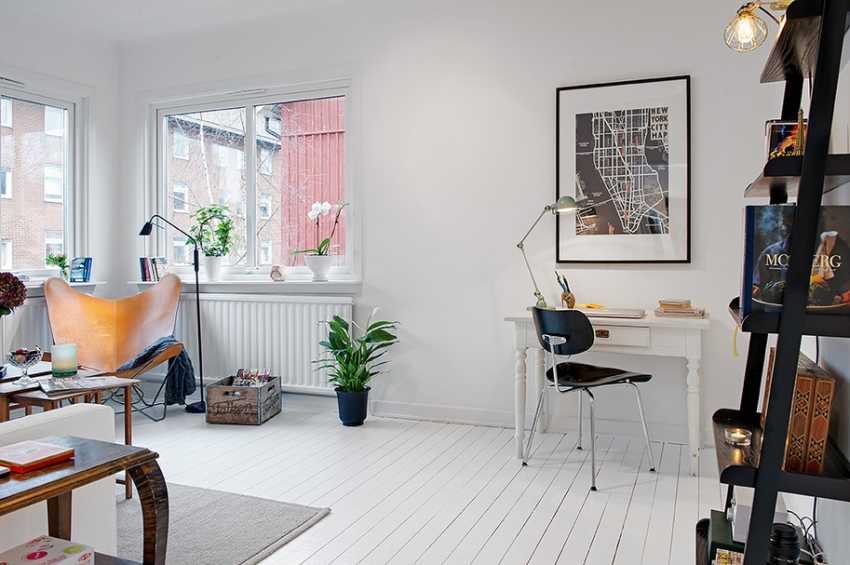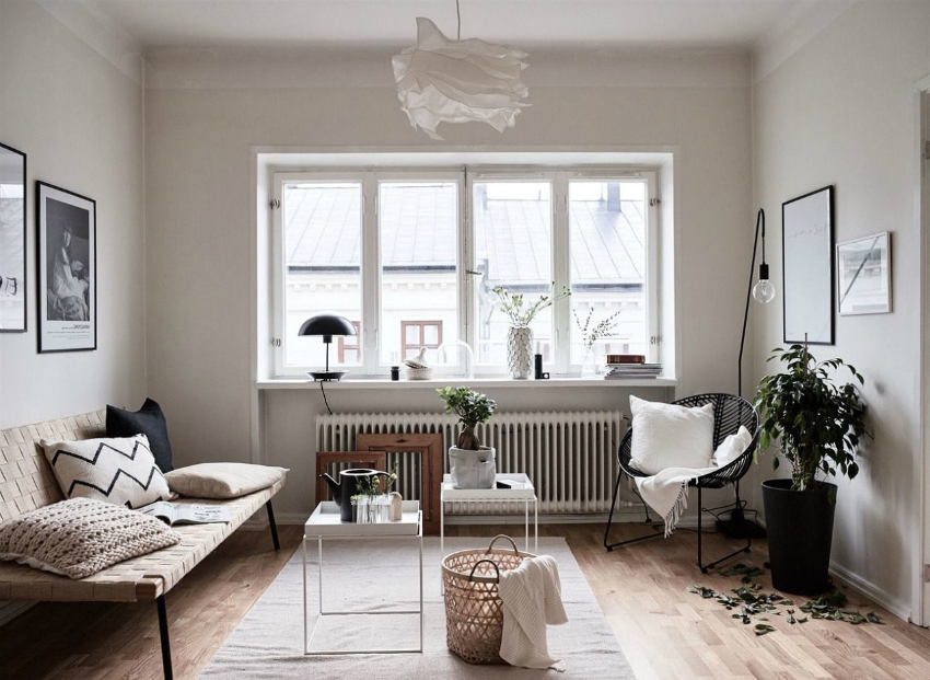 The interior, decorated in a monochromatic white color scheme, looks very cozy due to the decor and indoor plants