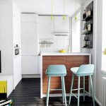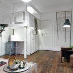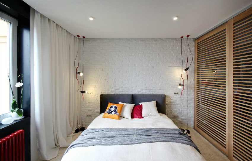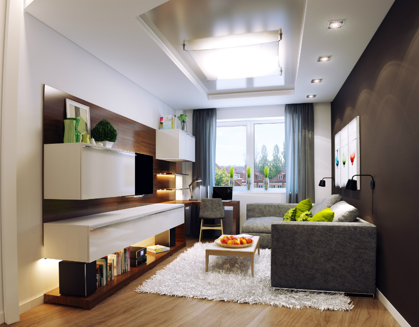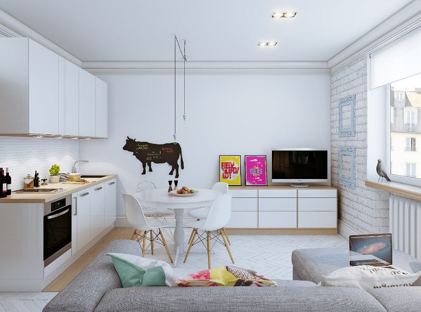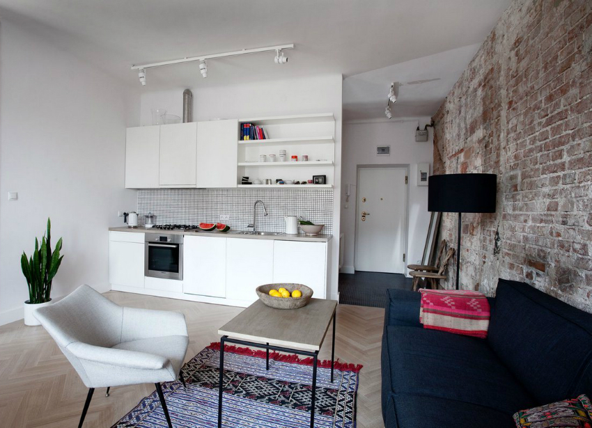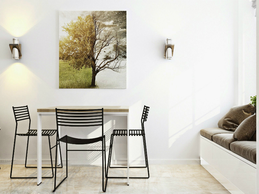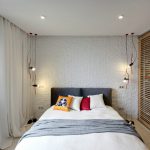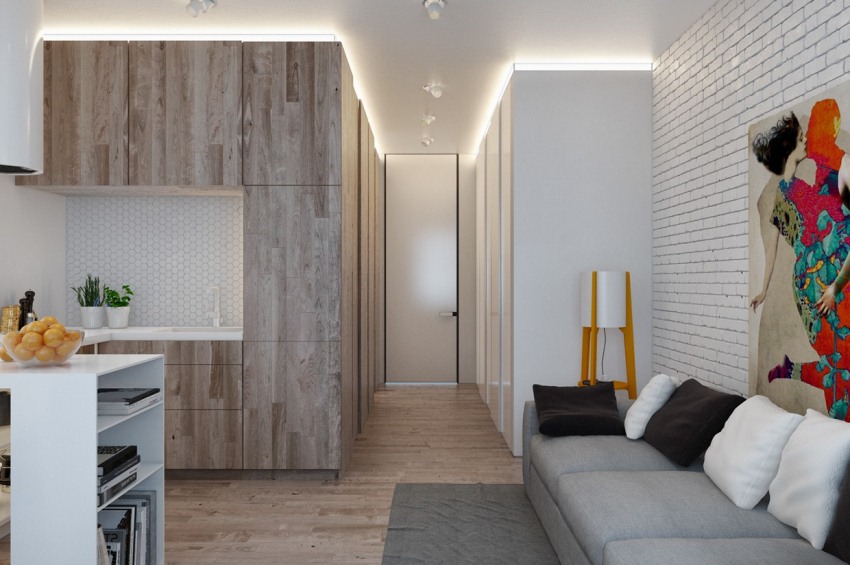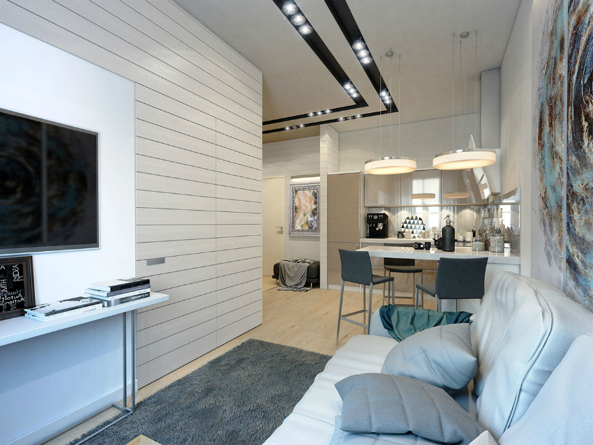 The ceiling should be decorated in a tone lighter than the walls. This will add extra height to the small space. The maximum freedom will be brought by the use of spotlights, small chandeliers, wall sconces, small shades hanging parallel from the ceiling. On the example of the interior of a small apartment (the photo confirms this), combined lighting was used with the help of bright spotlights and wall sconces.