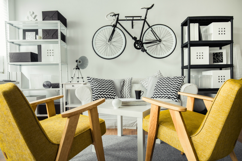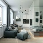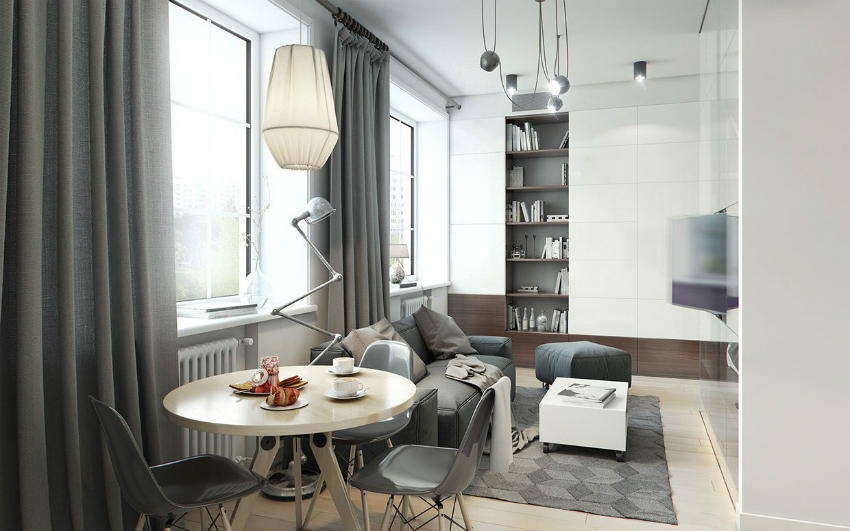 There should be a minimum of furniture in a modern apartment. It should be as functional as possible, but not too cumbersome. Modern mobile furniture is ideal for this task: wardrobes full-wall storage, folding sofas with internal niches, bunk coffee tables, soft poufs with interior space. Illustrative examples of the use of mobile furniture can be seen in the photo of a one-room apartment of 34 sq. m., the interior of which is made in the style of minimalism.