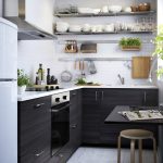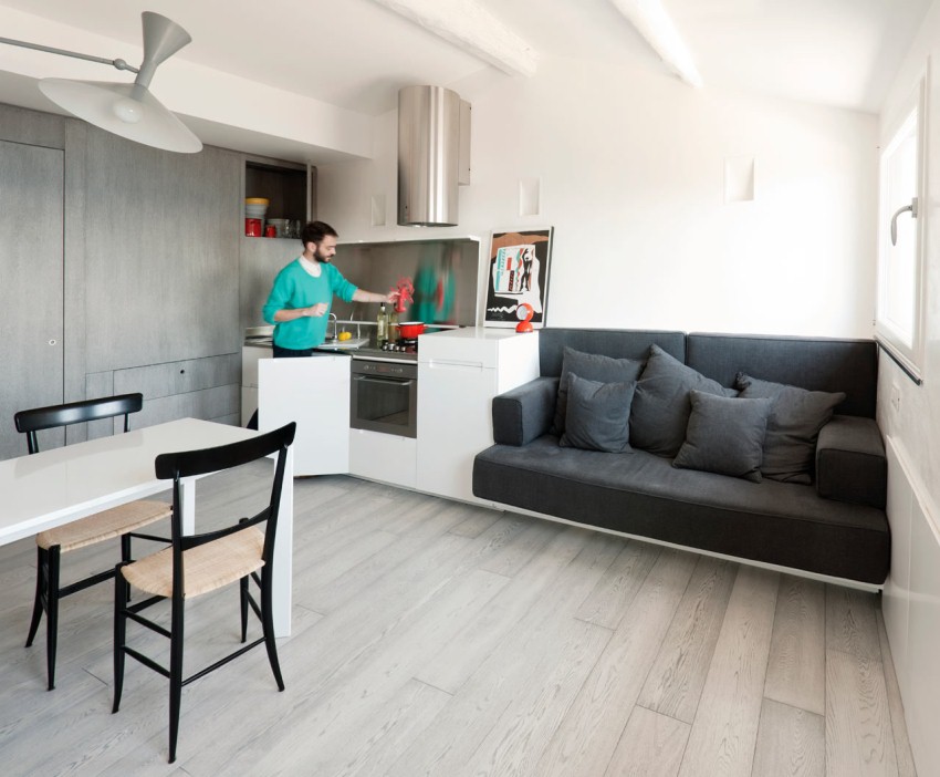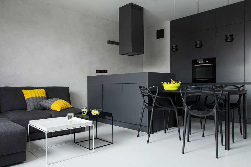 Kitchen furniture should be as compact and spacious as possible. All household appliances should be built in or hidden in deep cabinets. Fridge should be placed in the corner farthest from the door, or in a niche.Photos of the interiors of a one-room apartment with a similar placement of equipment clearly demonstrate this. For the dining area, you can pick up a small oval or round table with corner sofa, which has hollow niches under the seat for storing various things. To save space, you can install a foldable or sliding table.
