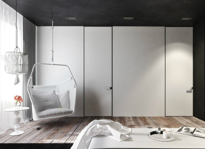 A white stretch ceiling will look perfect. Its surface can be glossy or matte. For classic minimalism, a calm matte surface is suitable, and for more modern styles, it is better to use a gloss that will additionally reflect light. Using drywall, you can create a custom ceiling or paint it with white paint.