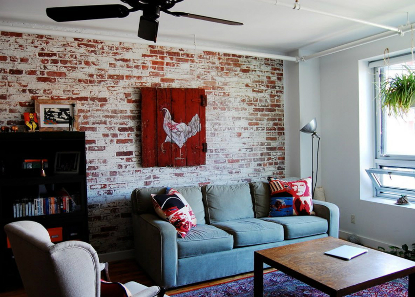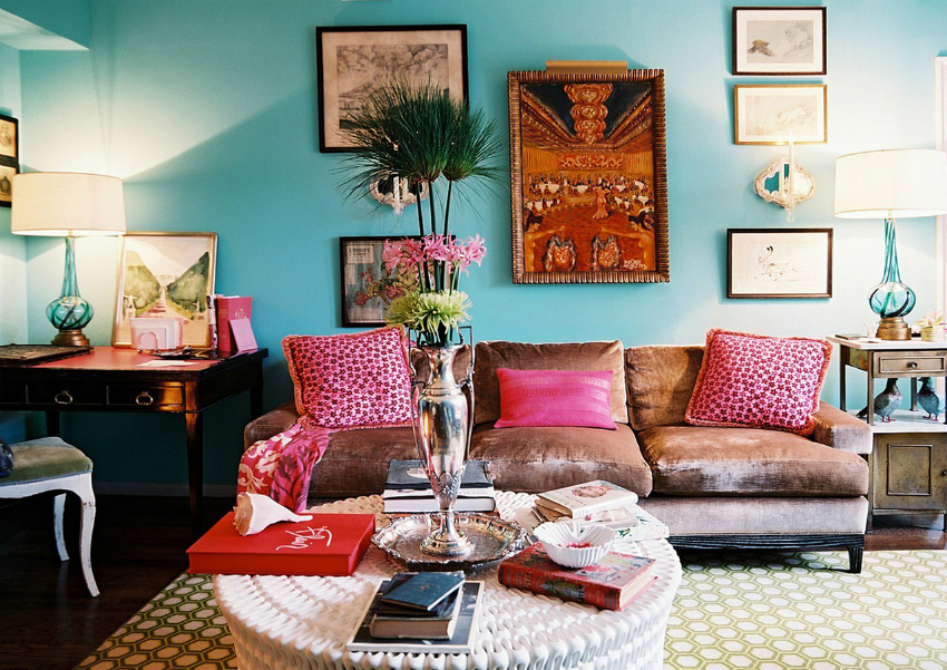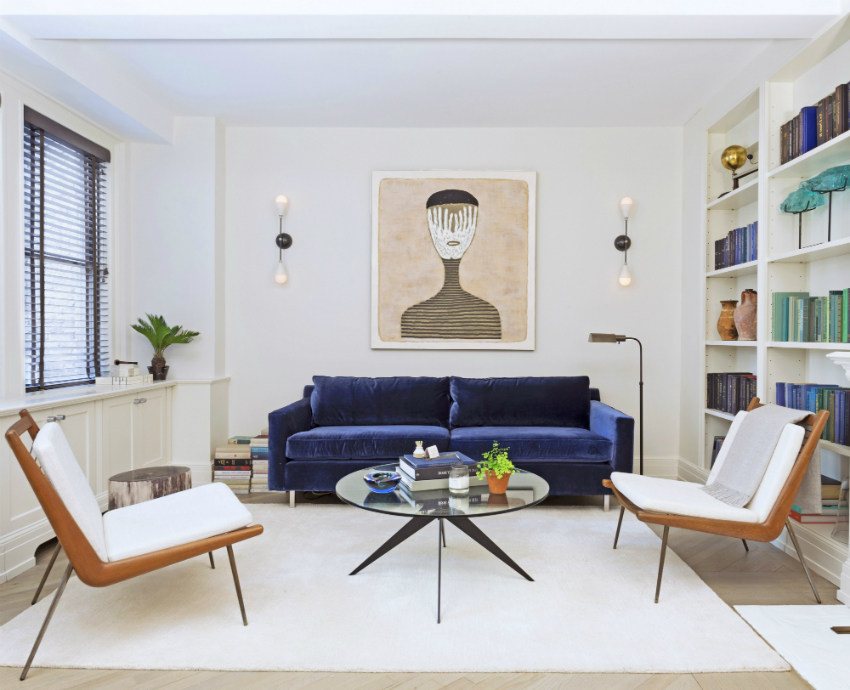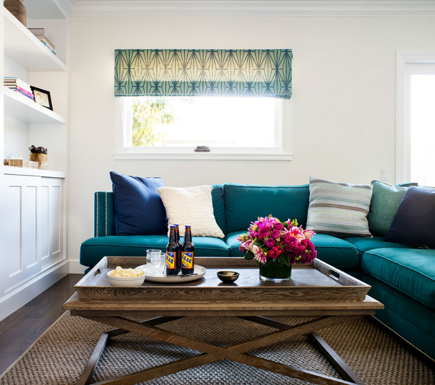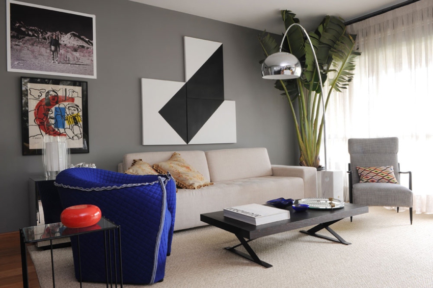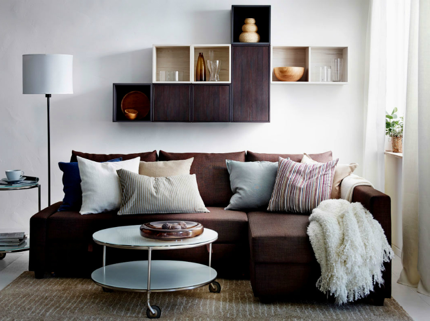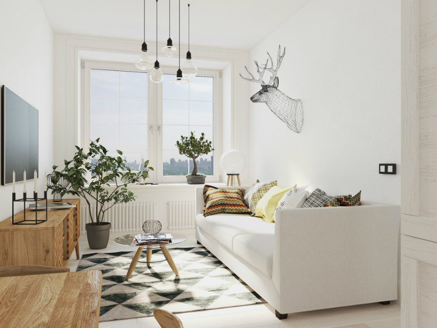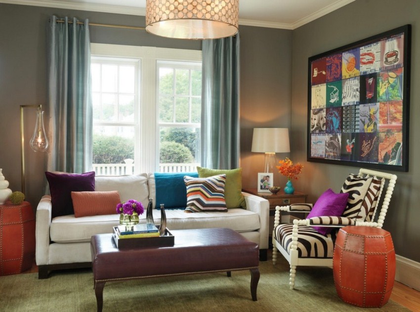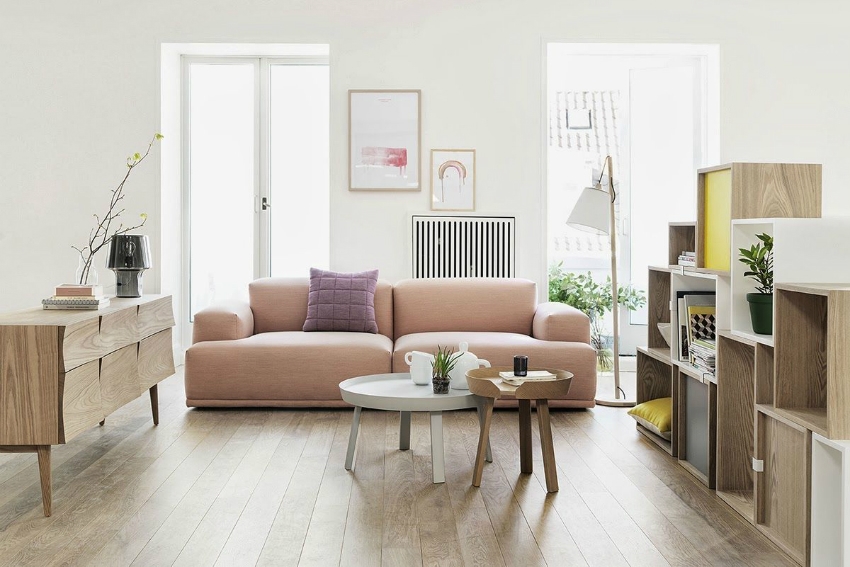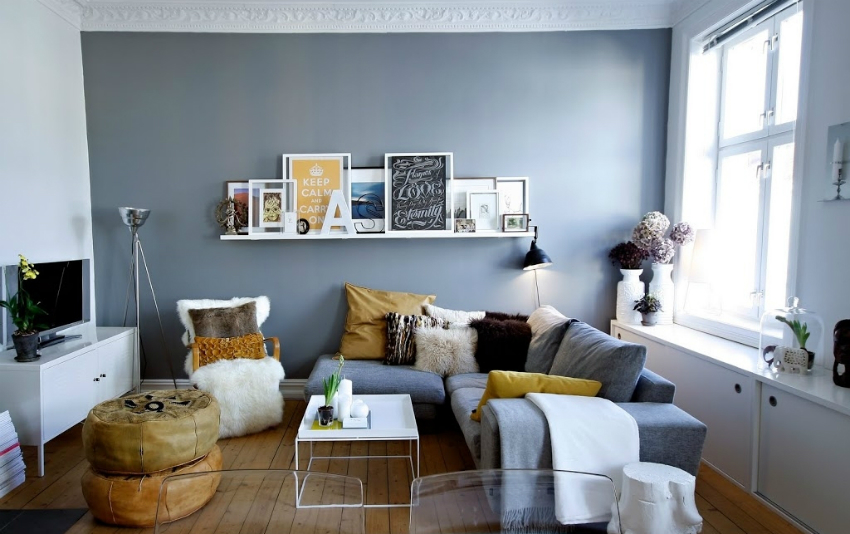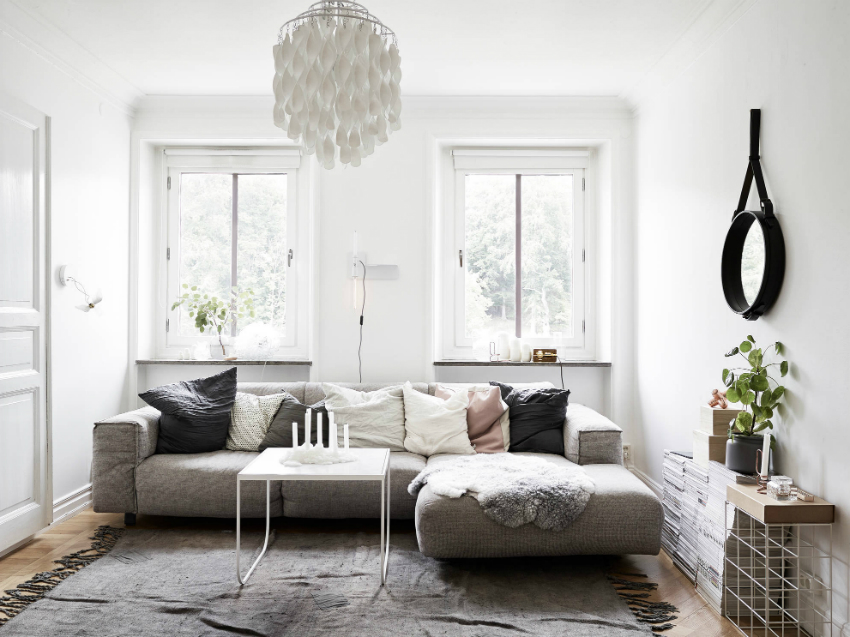 The main piece of furniture in any living room is a comfortable, stylish and cozy sofa. The most popular are gray, beige, brown and navy blue. Purple, green, peach sofa also look good on a light background.