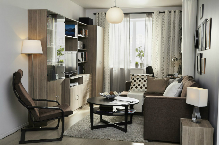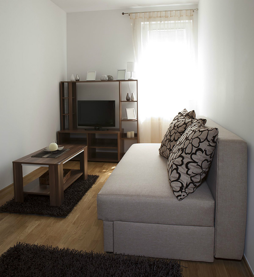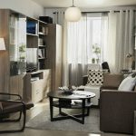 Around the sofa, you can arrange armchairs or soft poufs for guests. A small round or oval glass coffee table can be placed near the sofa. Various options for placing furniture in the hall of a small apartment, photos of the interiors of which can be found on the Internet, allow you to choose the most successful solution for a particular case.