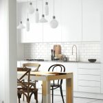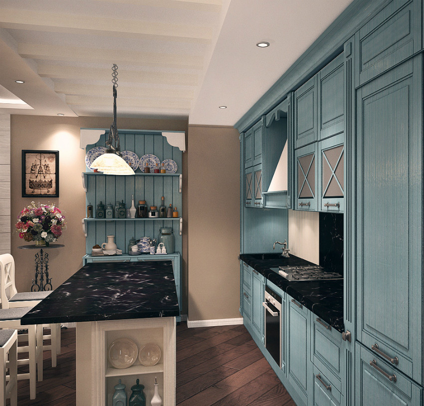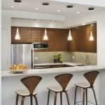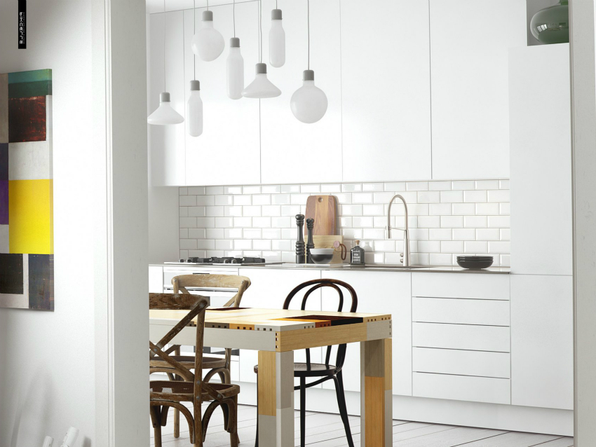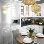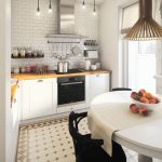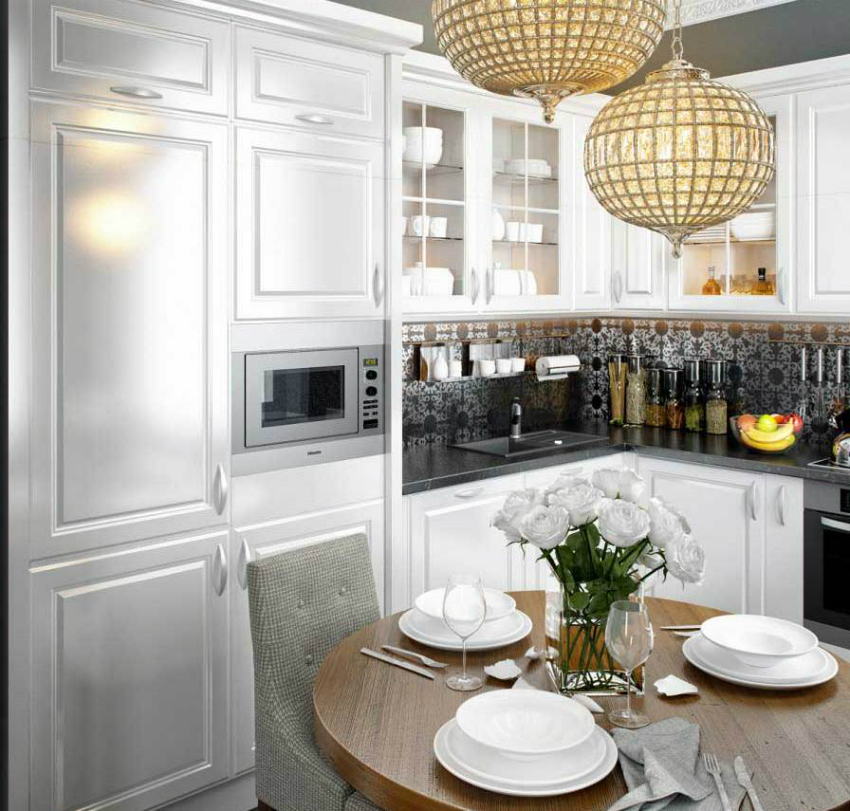 To illuminate the kitchen, spotlights are most often used, which are placed around the entire perimeter of the ceiling, focusing on the working area. Luminaires can also be built directly into furniture. The dining area can be illuminated with a wall sconce or a small chandelier that matches the chosen style.