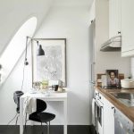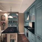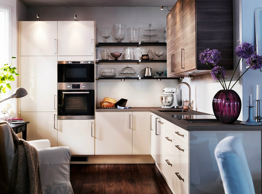 Kitchen furniture should be done in calm, neutral colors. The ideal solution is considered to be glossy facades that reflect light and illusoryly enlarge the room. Additional airiness to a small room will be given by hanging glass shelves, on which it is convenient to sit a table service or wine glasses.