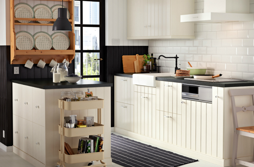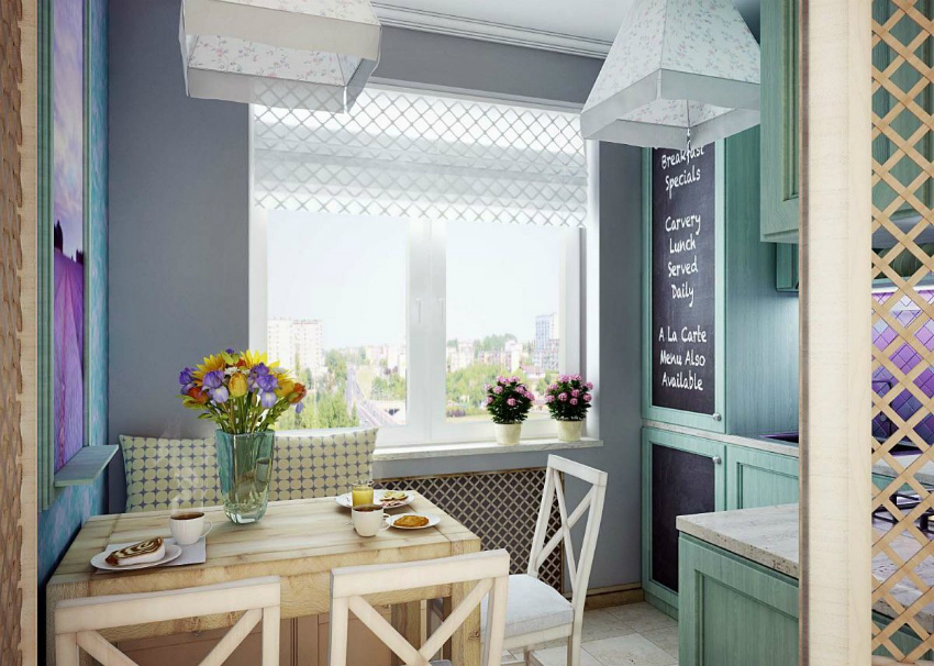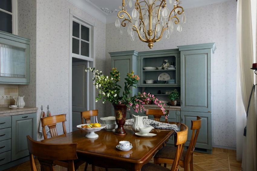 For wall decoration, give preference to pastel shades that make the room airy and are able to reflect more light. Curtains with bright large ornaments, flowerpots with indoor flowers, wall clocks, paintings with a characteristic still life will help to add brightness to the kitchen.