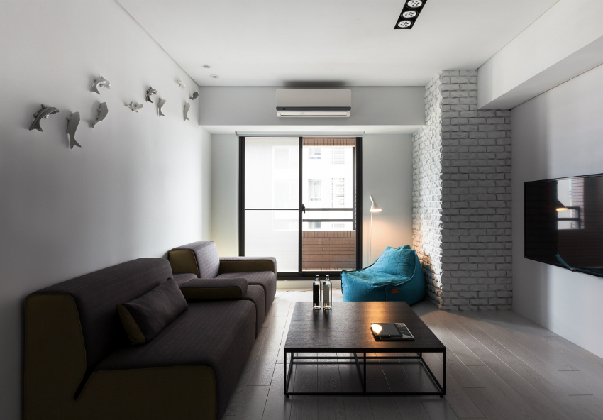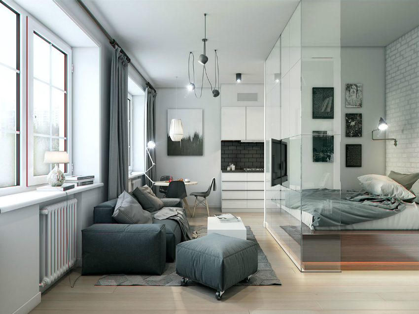The room is decorated in a monochromatic light palette without unnecessary bright accents. For wall decoration, it is permissible to use natural materials such as stone, concrete, cork fiber. This style assumes a minimum amount of furniture, decorative elements, textiles. Everything should merge into a common airspace. Glass walls can be a good design solution, which will additionally increase the size of the room, which is clearly displayed by photos of the interior of a small apartment.