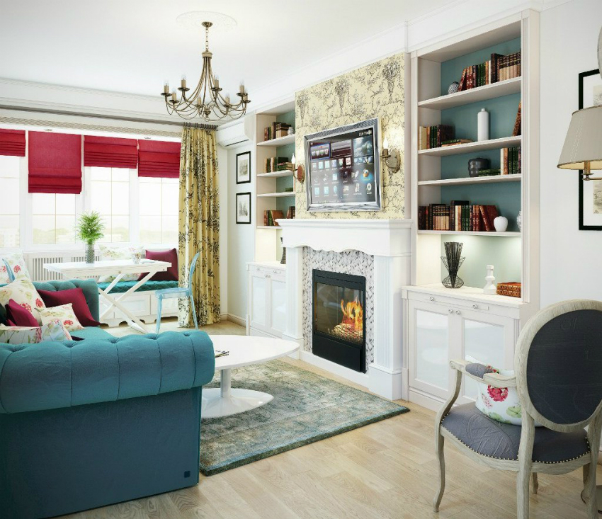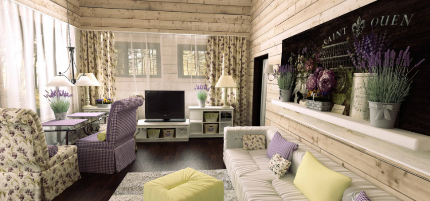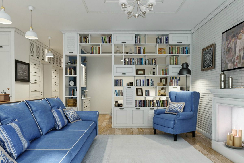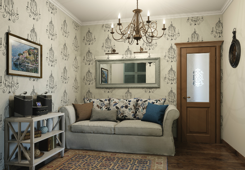 Products made of snow-white porcelain, ceramics with patterns of floral motifs and abstract illustrations will look perfect as decorative elements. Translucent, flowing curtains should allow the maximum flow of natural light into the room. Textiles should be chosen from chintz, satin, cambric with bright ornaments that will dilute the plain room. The room, decorated in the Provence style, can be seen in the photo of the interior of a one-room apartment of 30 sq.m.
