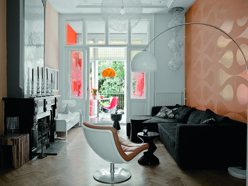 Comfortable, interesting furniture as well as textured wallpaper for the hall help to create a unique interior