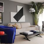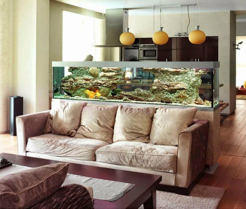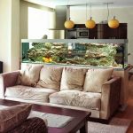 Artificial lighting should flood the hall with bright light. The location of light sources of different power depends on the functionality of the zones. Wall sconces should be placed above the soft corner, which provide soft, dim light. The room can be supplemented with an interesting design floor lamp. If an aquarium will be installed in the room, it must also be illuminated.