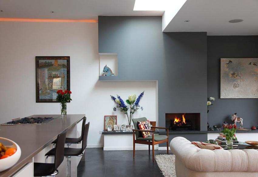 The minimalism style is considered one of the most common areas of modern design. This style excludes the use of unnecessary details, a large amount of furniture and a bright color palette. The walls of the room should be light and monochromatic. For one of the walls, you can use blue concrete, embossed natural or artificial stone, texture, cork panels.