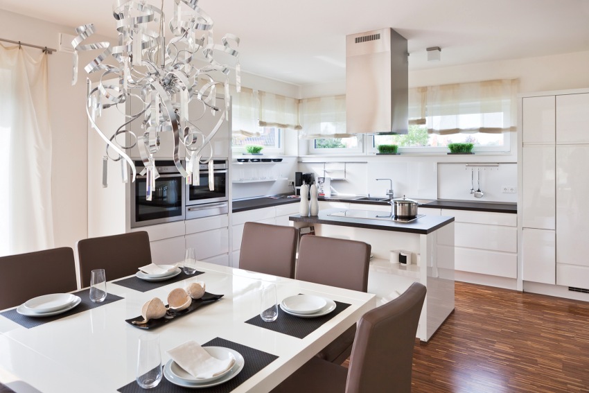The use of glass furniture will add a touch of sophistication to the modern interior of the kitchen. These can be tables, open shelves, which can be safely supplemented with elements of translucent plastic.