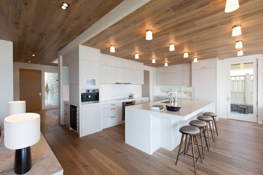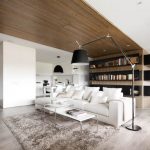 Modern design uses mounted or stretch ceilings. They can have a glossy design, which visually significantly increases the height of the room. Built-in artificial lighting elements will help zone the room.