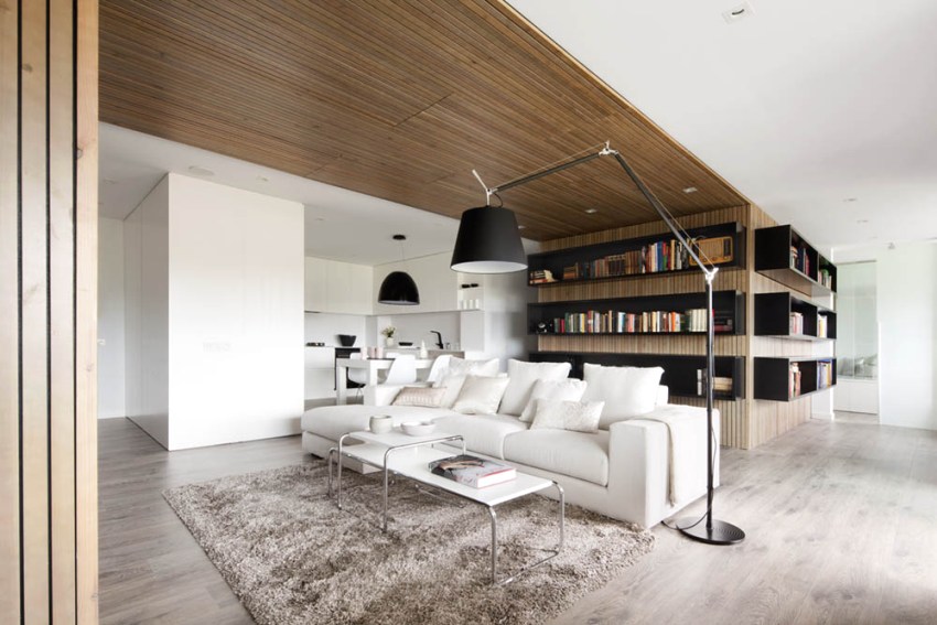 The ceiling should be made in clear, straight lines with an even, monochromatic texture. Furniture should be discreet, simple, blend in with the general space, creating a sense of airiness. There should be a minimum of decorative elements. All personal belongings should be hidden from prying eyes.