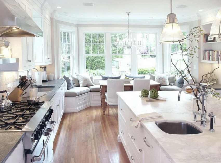 Classics in the interior of the kitchen are reflected in light textiles and graceful lines of furniture and decor