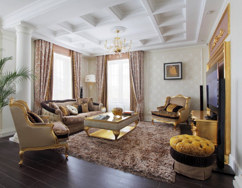 Baroque is characterized by opulence, luxury and pomp. The attraction to excesses is visible here. This direction was in demand in the design of palaces, for the interior of which pomp and grandeur served as the fundamental factors. Currently baroque style often used to create a living room interior. Photos of the classic room clearly show the luxurious and rich design. Another trend similar in characteristics is rococo, which is characterized by the use of elite materials, gilded furniture, expensive textiles, and elegant compositions.