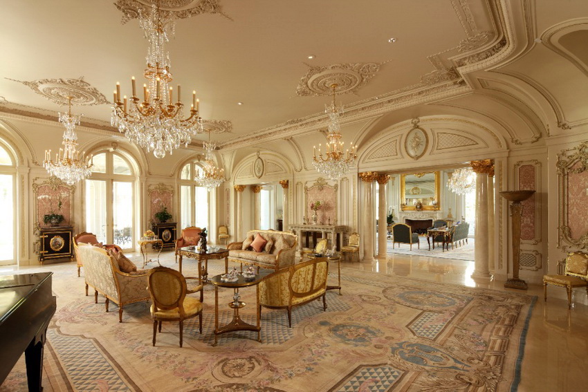 If the walls are finished with smooth material, then the high white ceiling is decorated with stucco or fresco, which should overlap with the decoration of the columns or pilasters. Parquet, marble or mosaic are used as flooring. Common elements of a classic living room are marble columns supporting the vault or against the walls.