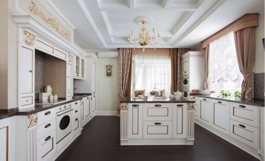 A large round clock with Roman numerals, forged items with gilding, porcelain dishes, and ceramic figurines will look appropriate as a decor in the kitchen. For a holistic and complete kitchen interior in a classic style, you should choose characteristic textiles. It should be presented with natural fabrics in a light palette (from white to beige) with the possible presence of golden ornaments. In a small room, the window is covered with a translucent light curtain. For a spacious kitchen, you can choose heavy draped curtains made of satin, brocade, satin or jacquard.