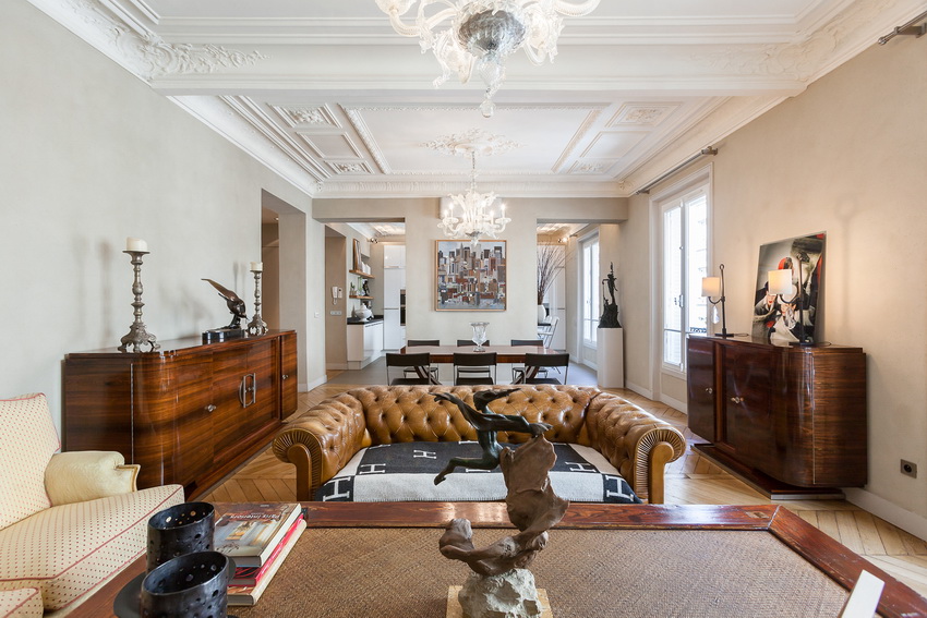 In a classic interior, you can often see wall panels made of natural wood and curly ceilings.