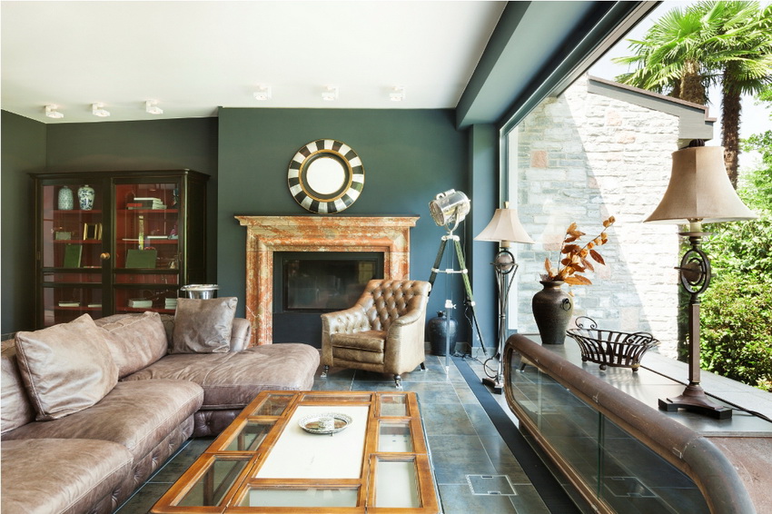 The central place in the living room in a classic style is given to the fireplace, which can be located against the wall, in the corner or in the center. Mosaic tiles or polished stone are used to frame it. The furniture is purchased massive, made from natural materials, with carvings, inlay and patina. The color of the furniture should be in harmony with the decoration of the room, and it is selected several shades darker. It is desirable that the fittings be made in gold or bronze.