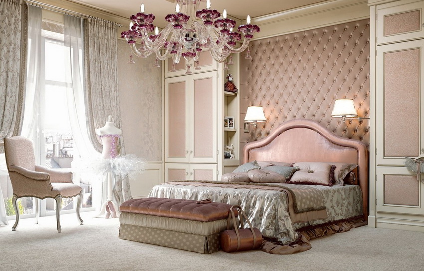 In a classic bedroom, the bed must necessarily be part of the headset, which includes a wardrobe with swing doors, bedside tables symmetrically placed on both sides of the bed, chest of drawersserving as a storage space and a stand for various accessories, dressing table with large mirror.