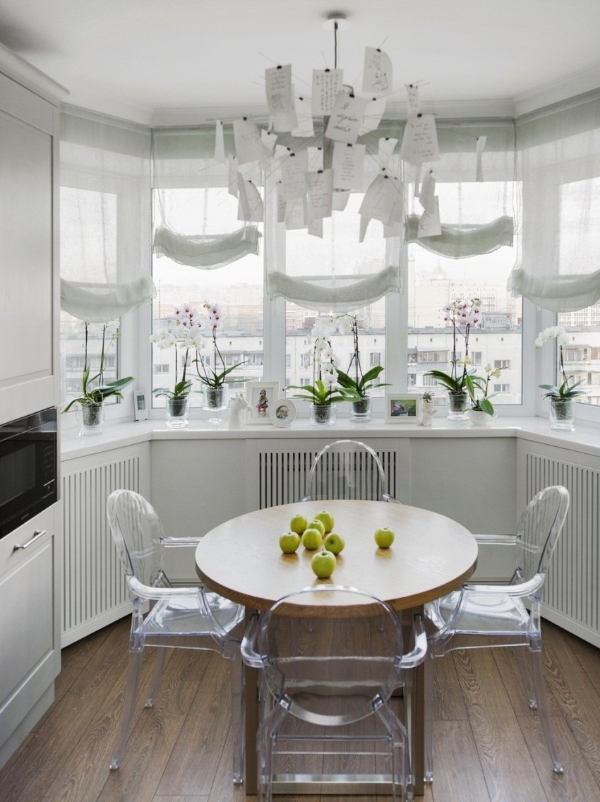 When choosing curtains, you must also take into account that the chosen fabric must be resistant to absorbing odors emanating from the kitchen. The care of such textiles should not be difficult. If you hang ordinary cotton or chintz curtains, they will need to be washed and ironed regularly before hanging. More practical materials are nylon and polyester.