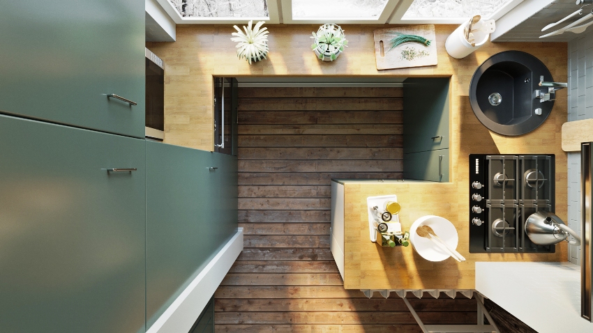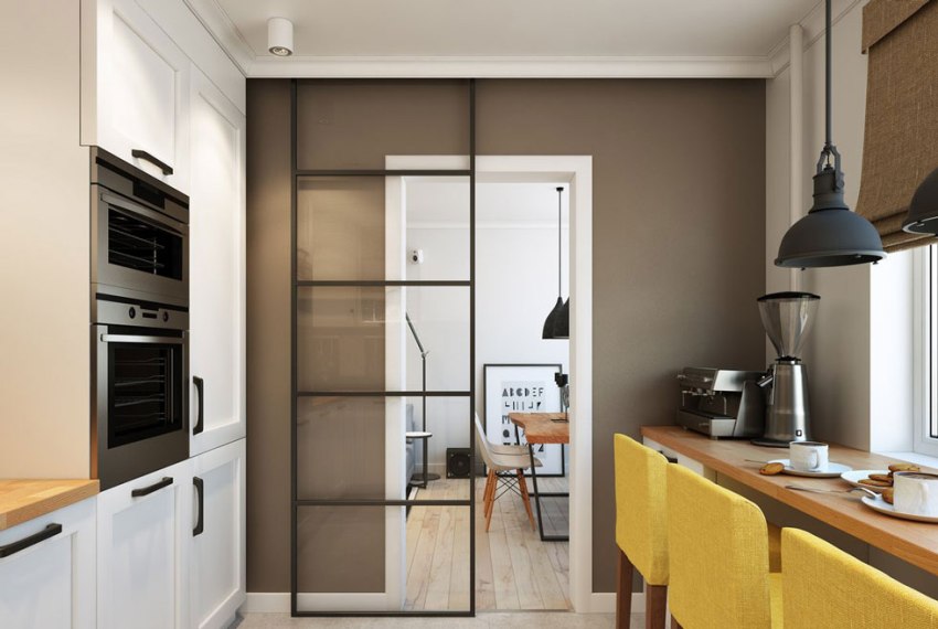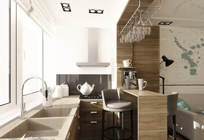 When decorating a mini-kitchen design, you should not try to fill the area with all the items. You need to understand that it should be convenient not only to be there, but also to move. During the cooking process, it is best when all items are at hand. In this case, one of the best ways to design a kitchen is the presence of a bar counter, which can play the role of a table top and a dining table. In addition, it is recommended to place more shelves, drawers and cabinets here.