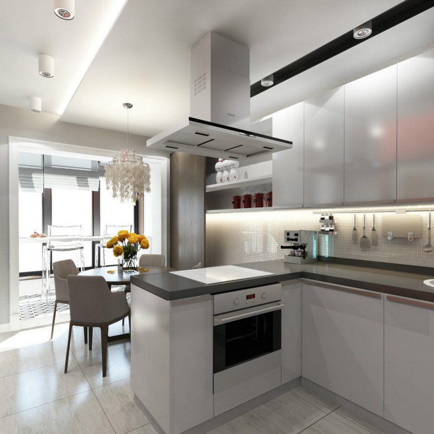 The main rule for designing kitchen designs with a balcony is 9 sq. m or less - use only those pieces of furniture and equipment that are really needed. If not so long ago it was considered expensive and difficult to find compact, but functional household appliances, now many well-known manufacturers are making electrical appliances designed for installation in small rooms. For example, such equipment includes a hob with horizontally located burners, of which there can be 2 or 4.