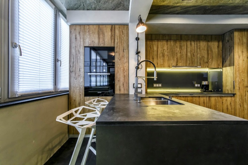 The presence of natural materials makes the interior of the balcony converted into a kitchen both cozy and stylish