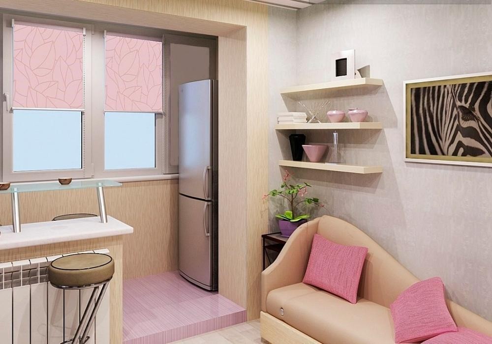 When making a joint space, it is not allowed to carry batteries and other elements connected to the centralized heating. Instead, consider the presence of electric heating or underfloor heating. In order to keep more heat in the apartment in winter, it is recommended to mount a sliding partition made of frosted glass on the border of the kitchen and the balcony.