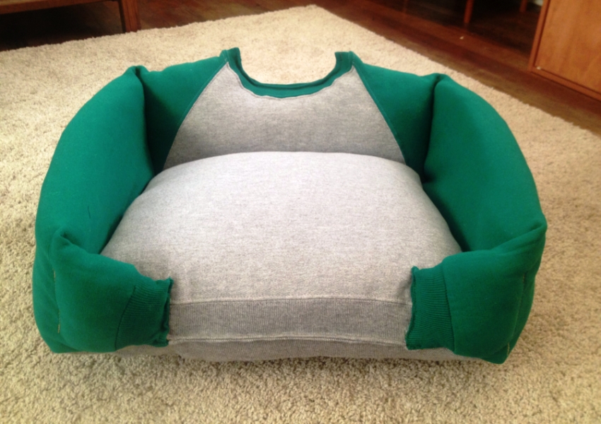 A simple budget dog bed made from an old sweater or jeans
