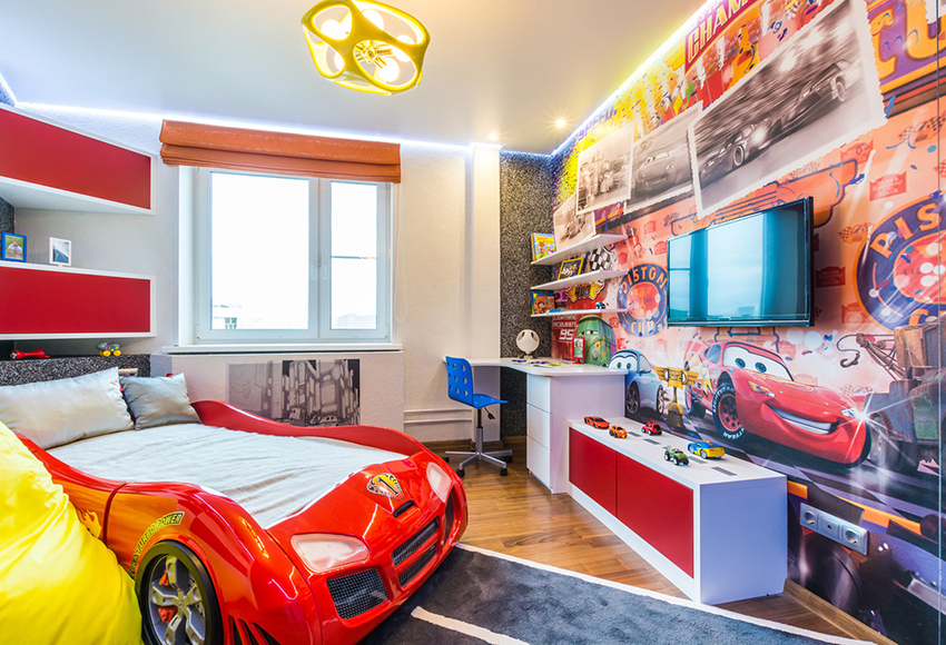 The use of materials with photo printing or photo wallpaper in a children's room for a boy makes it possible to achieve the necessary effects, for example, to highlight accents or to zone a space. Such decoration greatly facilitates the process of creating a holistic theme of the room, giving it a certain style. Using images of your child's favorite characters, you can create a special fairy-tale world for him.