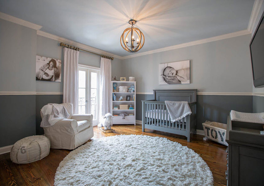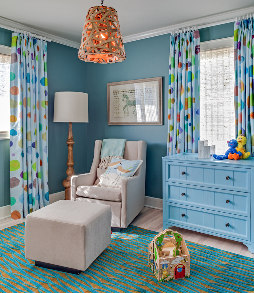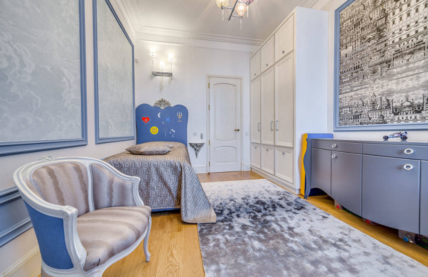 Most often, newborn boys are taken from the hospital in blue envelopes. It is this shade that people have long associated with the masculine principle. It is perfect for decorating a nursery and looks great in combination with white trim.