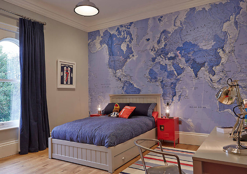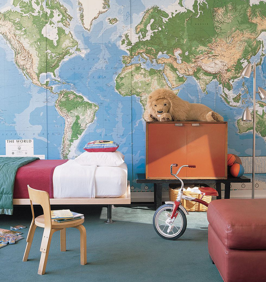 For children of this age group, a map will be a useful decorative element on the wall. It will allow the child to assess the scale of the world, as well as to become more familiar with its geography, for example, learn about the location of continents and countries.